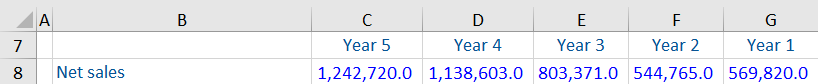 It can be seen that from Year 1 to Year 2 the net sales have dropped, but from Year 2 to Year 5 the net sales have increased markedly. To smooth out the fluctuations and find the stable growth each year, the annualized growth rate for sales can be calculated as follows: