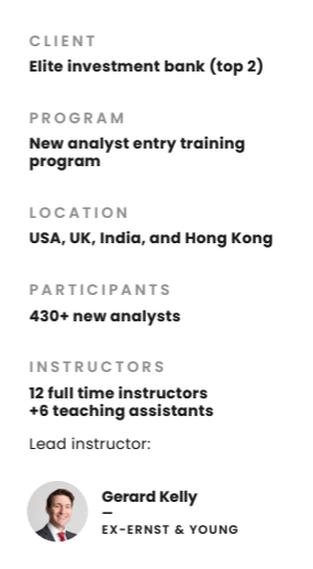 Another challenge was the pedigree of the bank’s new analysts – most of them were already quite experienced, and they needed more than just basics. The client wanted the intake of analysts to be the best on Wall Street, and wanted a custom program that challenged the cohort to be better informed and prepared than the competitions’ cohorts.