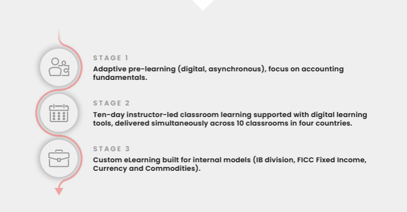 One of Wall Street’s most prestigious investment banks had previously used another provider to train their annual intake of over 400 analysts – all in one room. This approach was cumbersome, and created a range of issues, including participants in the back being unable to hear well, and trainers being unable to effectively spend time with individuals. Engagement in the program was underwhelming. Financial Edge was brought in as a replacement, and was tasked with delivering a more innovative solution to prepare the bank’s new analysts.
