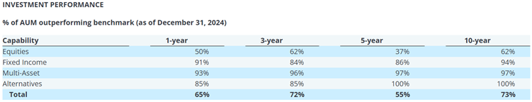 2. AUM is influenced by a couple of factors – as the value of assets is dynamic and changes over time that also impacts on the AUM of the firm. For example, if an Emerging Markets fund is performing well and delivers positive returns, the overall AUM will benefit. However, it is important that the performances of all of the firm’s funds are taken into account. Although not directly related, good performance also tends to attract more funds from investors, where those that perform poorly could further lose assets in the form of client redemptions. Below is an example of how is total investment performance reported in terms of asset classes – all of the firm’s funds in the asset class and what percentage of them delivered excess return against their target benchmark.