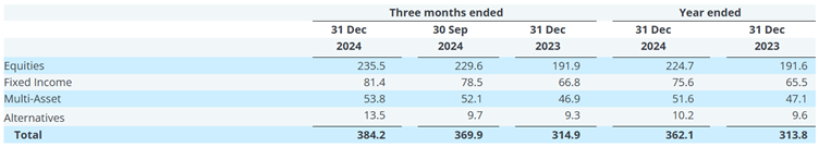 AUM follows a straightforward calculation where all of the funds that a firm manages, across asset classes are combined. Below is an example from the reports of Janus Henderson, a British-American asset manager headquartered in London.