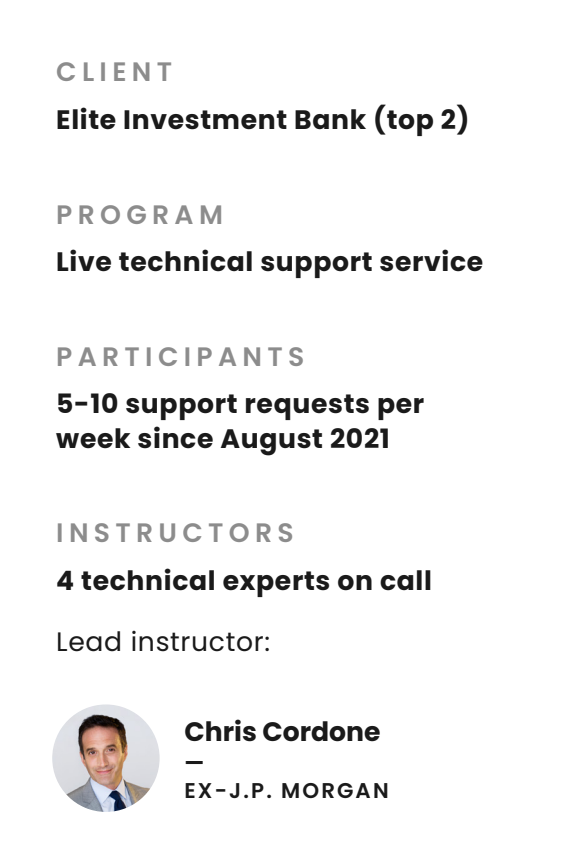 Financial Edge was approached by a senior banker at one of the world’s top investment banks who wanted help with supporting juniors after hours. This problem was intensified during lockdown – the seniors at the bank were concerned about business performance, as new analysts lacked the on-hand support that their predecessors had access to.