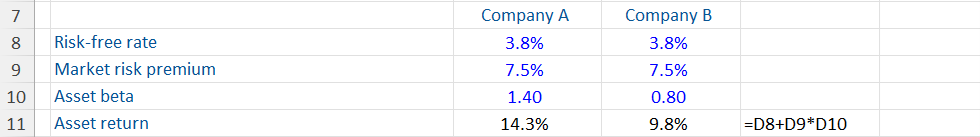 Company A has a higher beta of 1.4, indicating a higher systematic risk than the market. Company B has a lower asset beta of 0.8, indicating a lower systematic risk than the market.