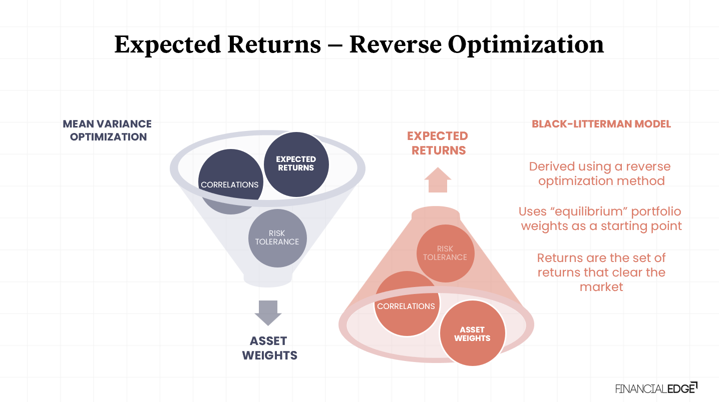 The starting point of the model is the global equilibrium, or “Equilibrium returns, which assumes that the aggregate of all portfolios in the market is optimal and therefore reduces the over-reliance on historical data (often an issue with traditional models). Then, it uses reverse optimisation by adding correlations and risk aversion coefficient to the asset weights that are deemed to be optimal. These are returns that would be expected if all assets were priced by the Capital Asset Pricing Model (CAPM).