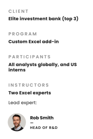 Financial Edge was approached by one of Wall Street’s top investment banks for help building a custom Excel add-in. Their existing add-in was no longer being updated or supported and they needed something built from the ground up that was more robust, capable, and customisable to better support their analysts. Financial Edge had previously delivered new hire training programs to the client, and so could be trusted to build it after proving our mastery of Excel and understanding of the client’s internal requirements.