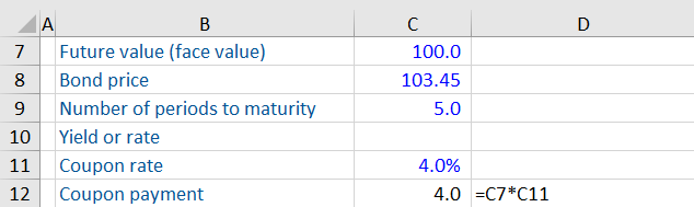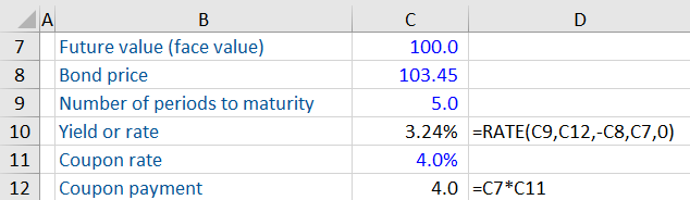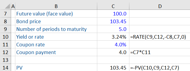 As can be seen, the present value of this bond is equal to 103.45 based on a coupon payment of 4.0, 5 years to maturity and an annual rate of return of 3.24%.