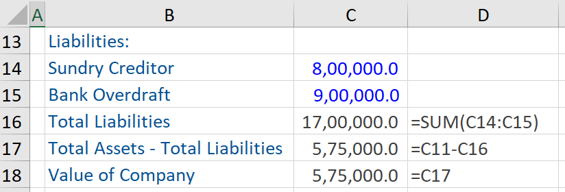 Below find an example of an asset-based valuation approach in which the value of the company is estimated by deducting total liabilities from total assets – both of which are obtained from the company’s balance sheet. The share capital and reserves and surplus are on the liabilities side of the balance sheet but these two items are not taken into account. Using this valuation approach, the company is valued at US$ 575,000.
