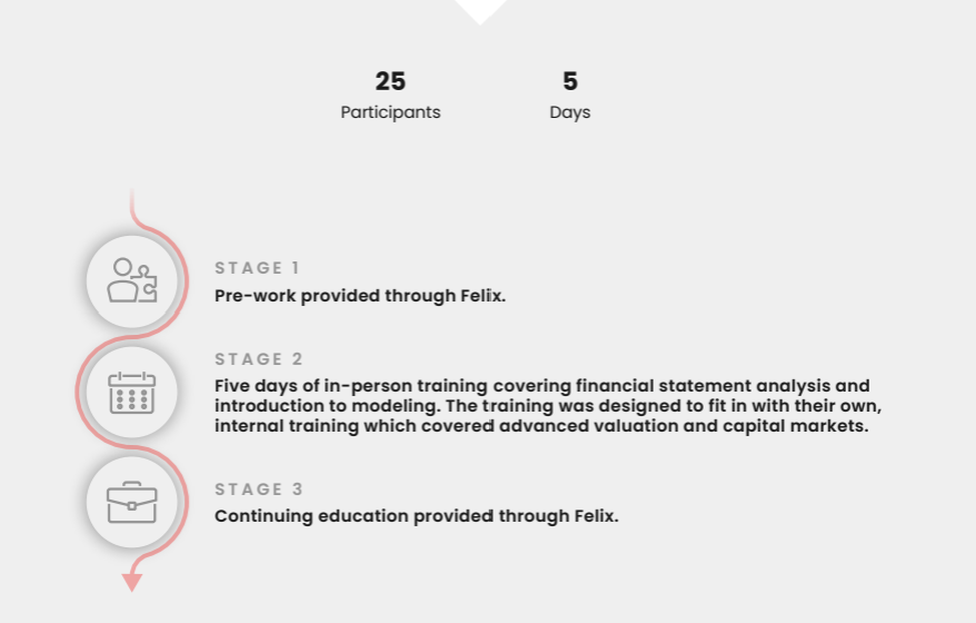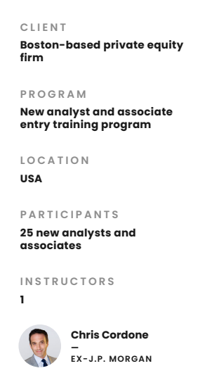 This private equity firm’s previous training solution was not fully tailored to private markets, companies, and the type of metrics and technical skills needed to effectively analyze both. They approached us to provide training for a mixed group of analysts and associates, to better suit their business needs.