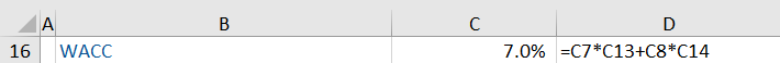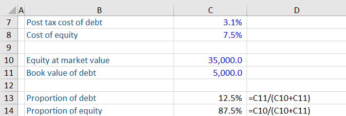 In the table below we see the debt and equity proportions calculated, along with the information required to calculate the WACC.