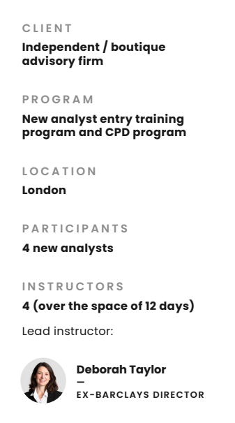 A London-based boutique M&A advisor felt their current training program did not support their analysts fully, was a little out of date and did not reflect the culture of their organization.
