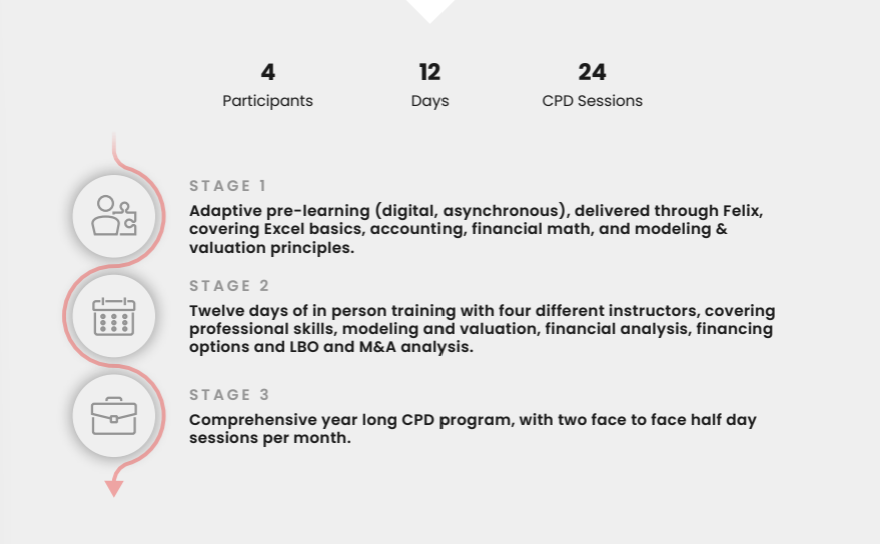 Financial Edge has years of experience creating tailored programs for firms of this size. Our team worked closely with stakeholders and subject matter experts within the business. We were given access to models and case studies to ensure the training was perfectly aligned and reflective of the deals they would work on. Throughout the planning process, we asked for regular feedback and kept open lines of communication with the L&D and front office teams.