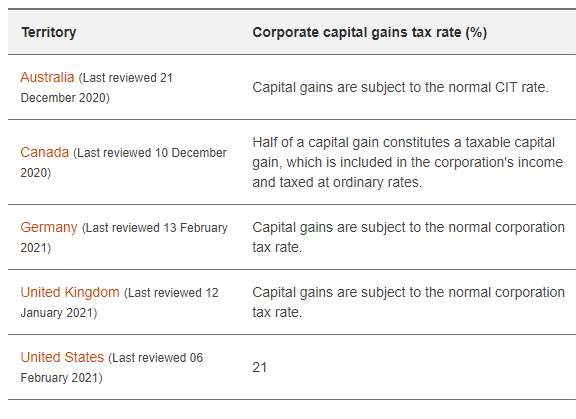 Here is a snapshot of the corporate capital gains tax rate for different countries.