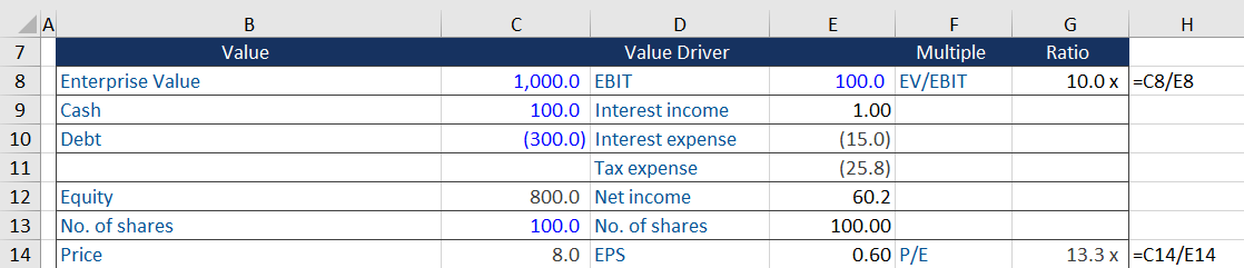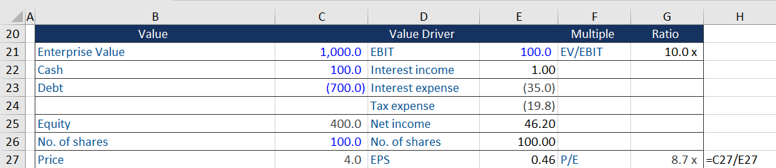 Notice the enterprise value has remained unchanged by the addition of debt. However, the equity value has dropped to 400 the price to earnings ratio has fallen to 8.7.