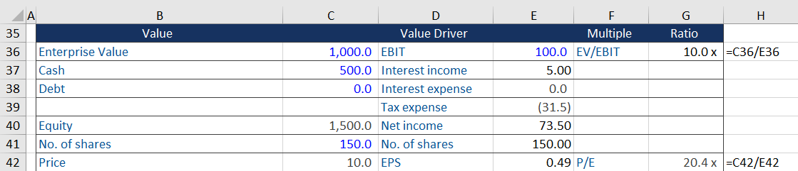 Now the P/E ratio is 20.4. As the PE ratio is now a blend of the Enterprise / EBIT multiple and the cash value to interest income multiple. Practice these calculations by accessing the free download.