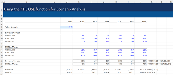 Using the CHOOSE function, we can create a dynamic model which switches between these assumptions, by changing the scenario number in cell C6.