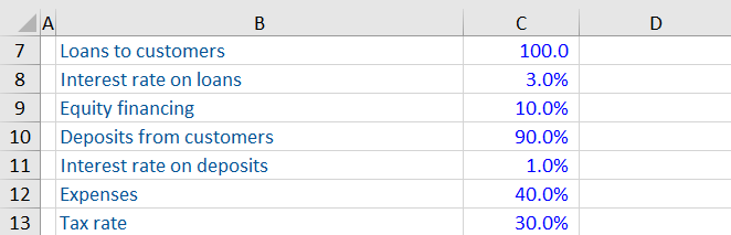 Banks are required to report their financial data to investors and other stakeholders. A bank’s balance sheet does not include items like plant and machinery, accounts receivable/payable, and inventory. A bank’s income statement is similar to that of other businesses and reports the bank’s profit and expenses over a financial period. Here, we build a basic balance sheet and income statement for a bank based on the following assumptions.