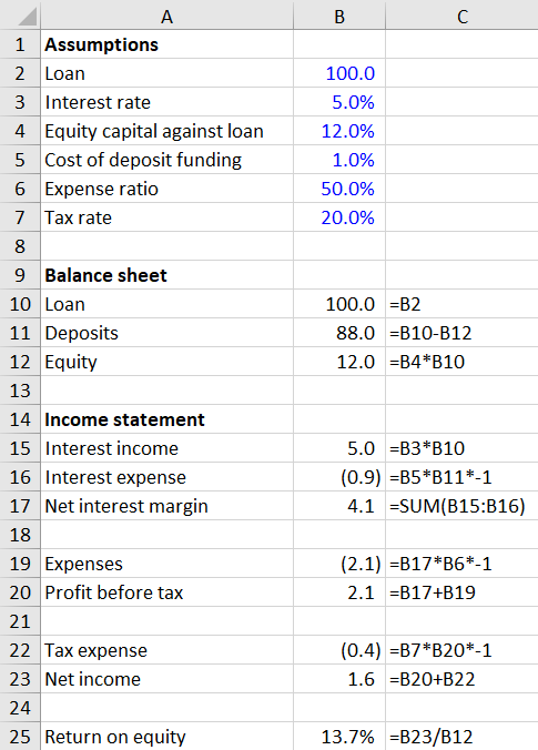 We are assuming a capital ratio of 12% so 12m of the loan is funded by equity and 88m is funded by deposits. We can then calculate an income statement using the interest rates, an assumption for the expense ratio and an assumption for the tax rate. Finally calculating the return on equity is important as that is a key value driver for a bank. So assuming the loan is fully drawn the bank gets a return on equity of 13.7%.