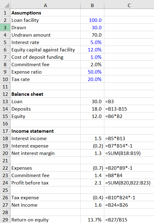 The key problem is the regulators still require 12m of equity capital against the facility despite only 30m being drawn. So the bank only makes 0.5m net income against equity capital of 12m and generates a terrible return on equity of 4.4%.
