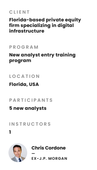 Through years of experience, we were able to suggest a program that catered to their needs in just five days, rather than the ten they had originally budgeted for. We delivered some of the more general financial analysis content as adaptive pre-learning in Felix. This allowed students to come to the instructor with any questions this presented, and for us to focus on more specialized and complex topics in the five days.