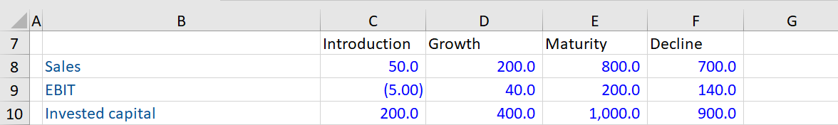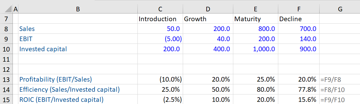 To understand how three performance metrics – profitability, efficiency, and return on invested capital (ROIC) – perform over different stages of a company’s lifecycle, given below is some information on how sales, EBIT, and Invested Capital of a company change over this cycle.