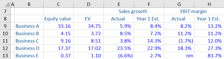 Business E looks like it has come out of restructuring, with very low EV, accompanied by negative sales growth and non-meaningful EBIT margin in the actual year.
