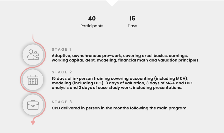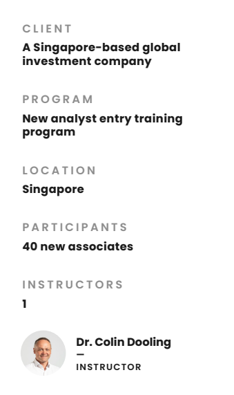 We have worked with this government-owned investment company for several years, running a new hire program. At the end of the program, the associates needed to possess a comprehensive technical skill set and be ready to work on real deals, creating value for the fund.