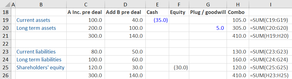 The equity of B Inc. no longer exists and must be zeroed out. A value of minus 30 is inputted into the cell. This effect can be inputted as -D25 (30.0) to reference B Inc’s shareholders’ equity.