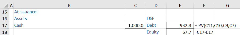 The difference between the convertible bond’s fair value and the equivalent non-convertible bond’s value is the value of the embedded option (67.7). This is an addition to the equity section of the company’s balance sheet. The company’s assets have increased by the 1,000 cash received, while liabilities have increased by 932.3 and shareholders’ equity by 67.7, keeping the balance sheet in balance.