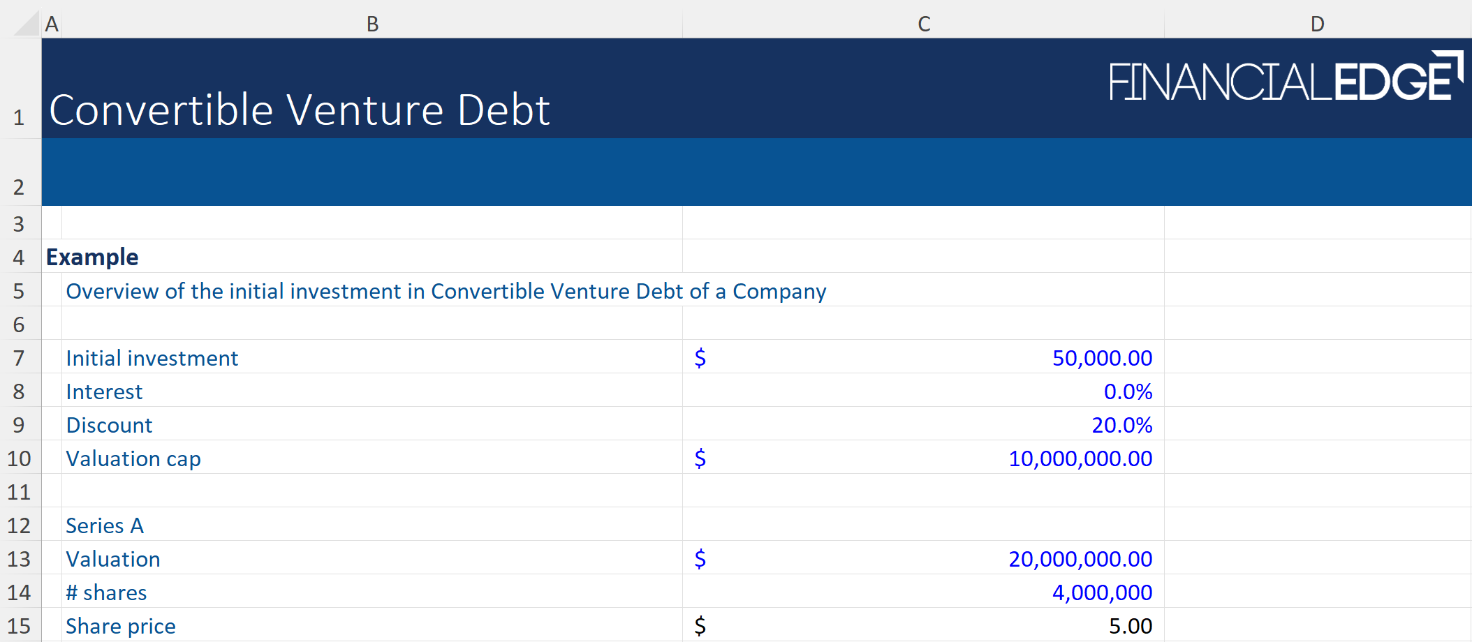 In this example we are going to look at three different types of convertible venture debt. Download the Financial Edge template to work through the answers and create your own spreadsheet for calculating venture debt conversions.