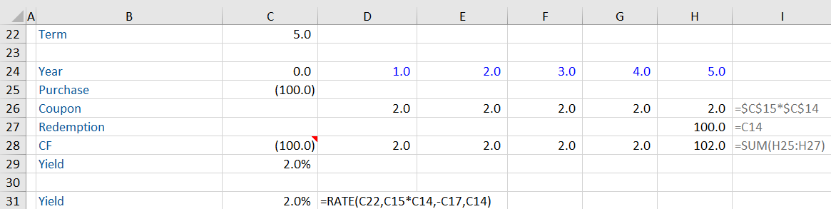 The assumption above assumes the interest is paid in perpetuity. However, in reality, most bonds are issued for a fixed term i.e. 5 years. Let us calculate the bond yield based on this new assumption. We need to put in the term and calculate using a DCF.