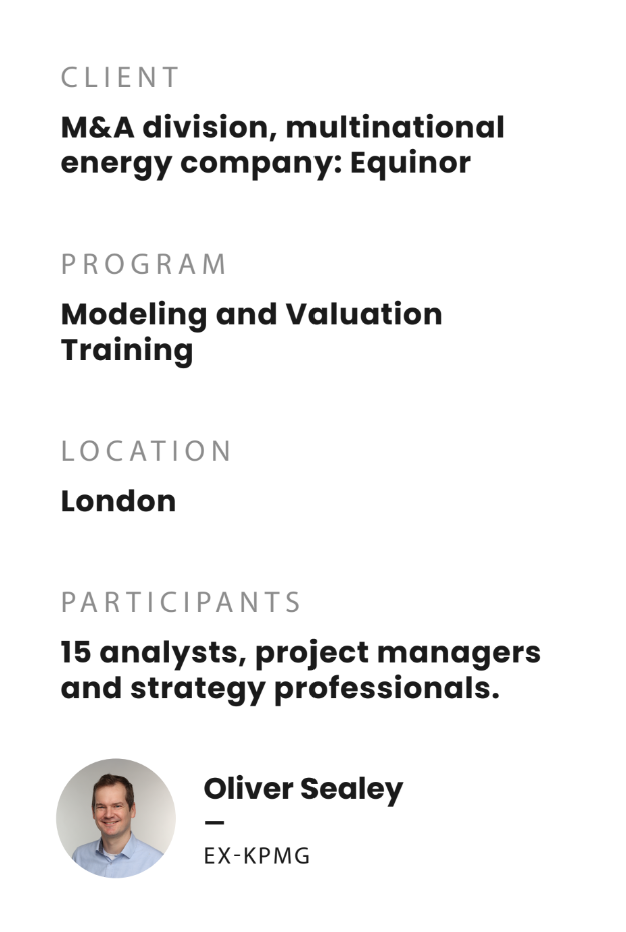 We’ve worked with this large energy company for several years to help ensure their London M&A team possess a rigorous technical skill set. They need to be confident in assessing potential acquisitions and creating value for the firm.