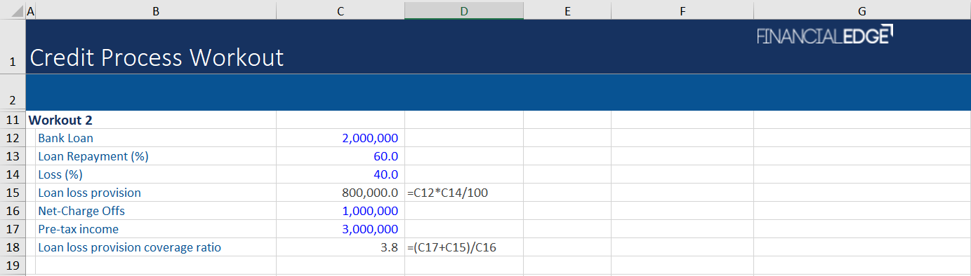 But the bank collects not 60% of the repayment (US$ 12 million), but only US$10 million, and the net charge-off is US$10 million. Further, the bank records pre-tax income of US$ 3 million. From this data, we calculate the loan loss provision coverage ratio (3.8%).