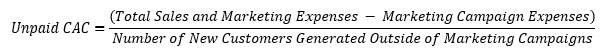 This is the CAC related to sales and marketing expenses excluding paid marketing campaigns. Unpaid CAC demonstrates the cost of acquiring customers through organic channels and other non-paid efforts. To calculate unpaid CAC, take total sales and marketing expenses, and subtract from this the marketing campaign expenses, then divide this number by the number of new customers generated outside our marketing campaigns.