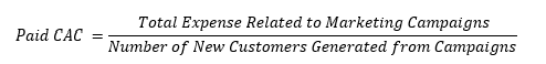 This is the CAC only related to paid marketing campaigns such as the cost of an advertising campaign on Facebook. The paid CAC is useful for evaluating the viability of a business and whether a company can scale up its customer acquisition budget profitably. Paid CAC is often higher than blended CAC because marketing campaigns may not be the primary source of new customers. To calculate paid CAC, take the total expense related to marketing campaigns and divide it by the number of new customers generated from these campaigns.