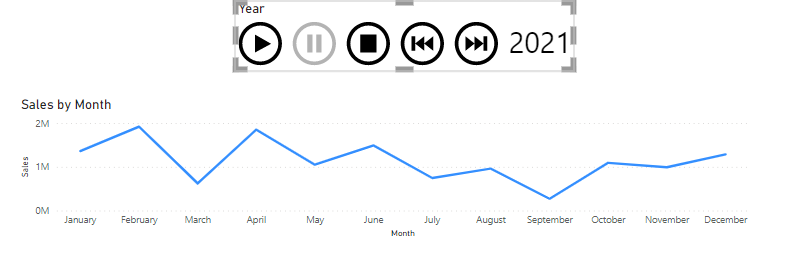 Animation allows users to visualize what is happening to data over a long period of time. The example below shows a play axis added to the Monthly Sales line chart. When Play is pressed, the line chart moves through each year automatically