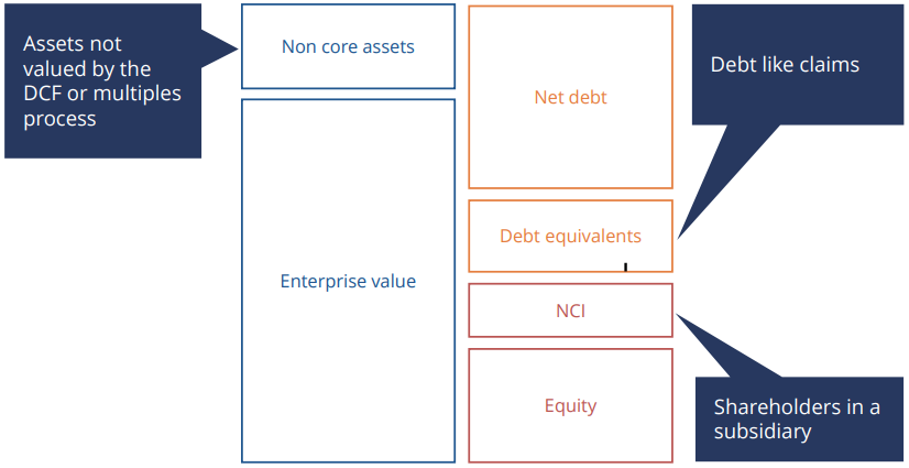 - In the EV to equity bridge, debt equivalents are a source of finance and must be included when calculated the company’s value
