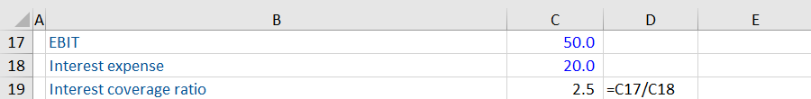 In the example above, the interest coverage ratio is 2.5, which is comfortable.