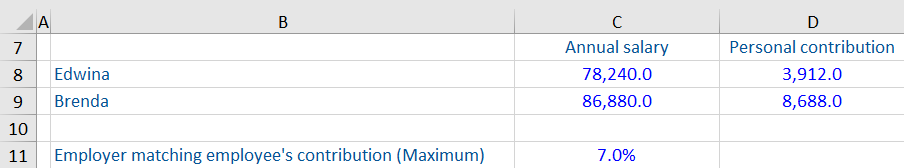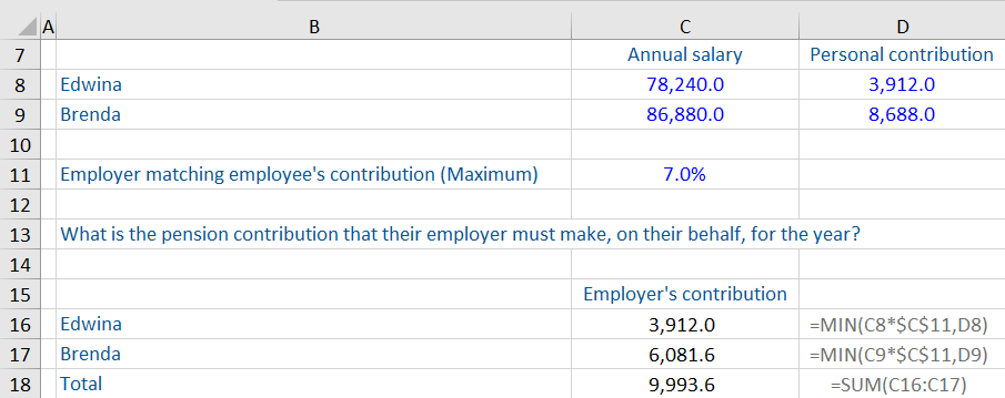 The employer’s contribution will be the minimum of the two values: 1) 7% of the employee’s annual salary, and 2) The employee’s personal contribution. Using the “minimum” function in Excel, we calculate the employer’s contributions as follows: