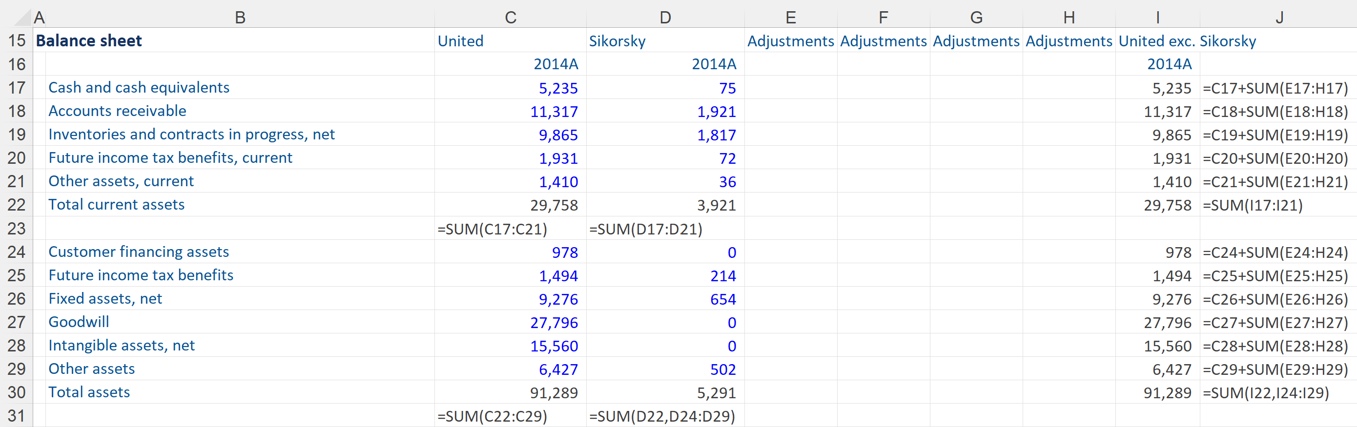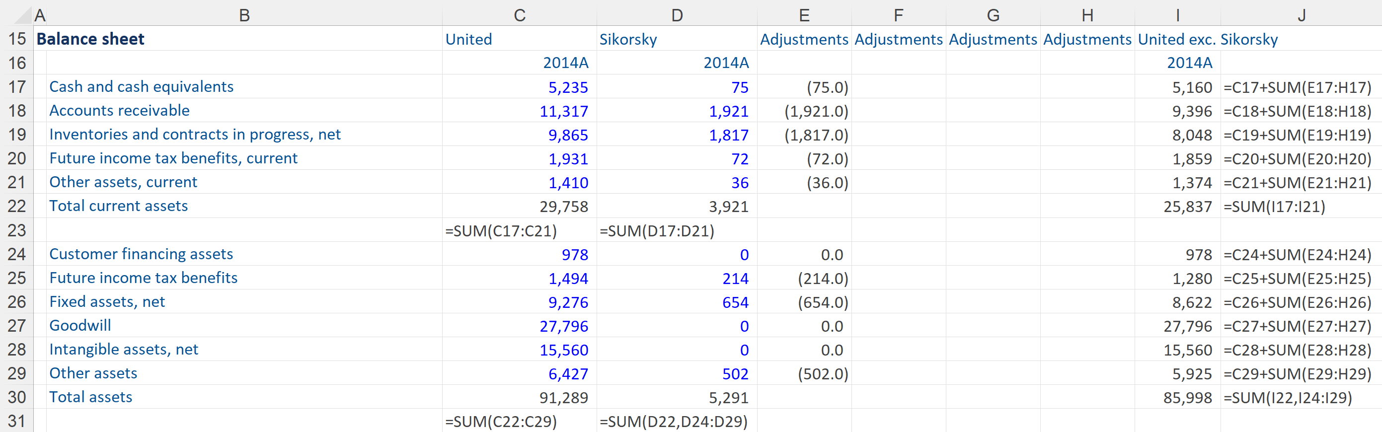 Once we have acquired the details of the subsidiary financials we can start to strip them out of the consolidated balance sheet to show a balance sheet for United Technologies excluding its subsidiary. All the subtotals need to be added up vertically. These calculations have to be set up before we put up all the adjustments. Please note that this process links to ‘adjustment’ columns not directly to the subsidiary financials, as this will be useful for later on. We have come up with our template of United which is ready to exclude the sold subsidiary, Sikorsky.