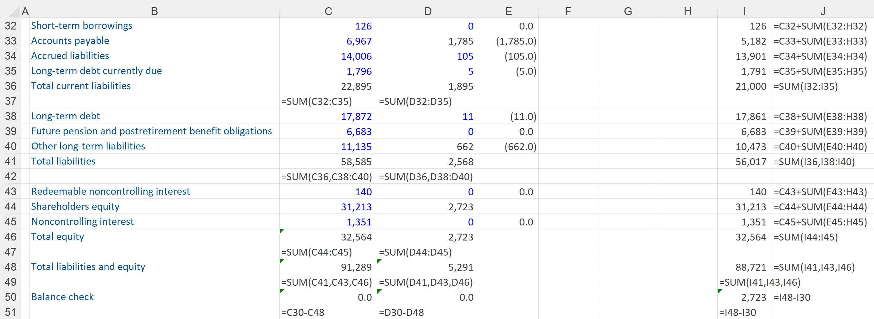 Below we can see the United Technologies balance sheet. It is showing both the Group balance sheet (in column C) and the standalone subsidiary, Sikorsky Aircraft (in column D). This workout also calculates the Group balance sheet excluding Sikorsky Aircraft (in column I).