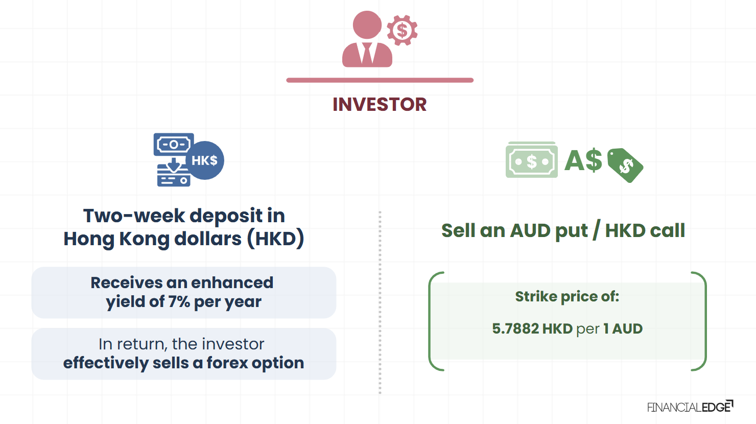 An investor deposits Hong Kong Dollars for two weeks and receives a 7% annual yield. In return, they sell an AUD put/HKD call option with a strike price of 5.7882. If the AUD/HKD exchange rate stays above this strike at maturity, the investor is repaid in HKD. If it falls below, the investor is repaid in AUD at the strike rate, which may be less favorable than the market rate.