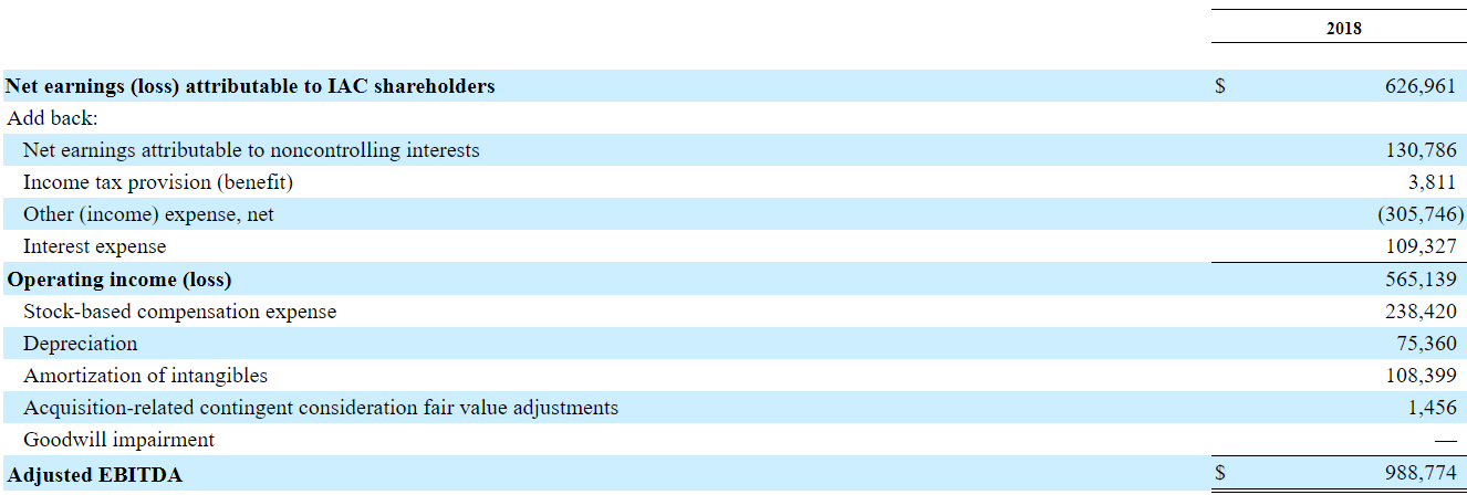 Corporations usually disclose their own calculation of EBITDA in their earnings press release, or 8-K document, if they are a publicly-traded company. You can start with these numbers but DO be careful. Here’s an example from IAC Inc’s letter to shareholders: