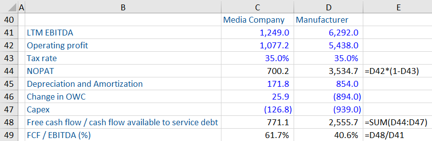 The media business converts $1 of EBITDA into 61.7 cents in free cash flow, compared to the manufacturer which converts $1 of EBITDA into just 40.6 cents in free cash flow.