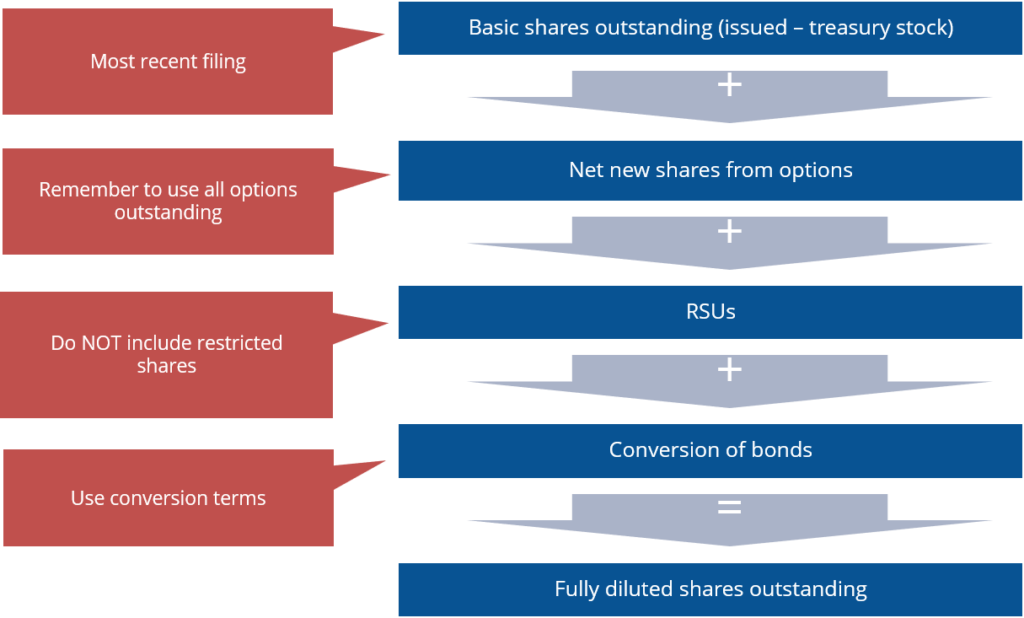 Finally, for convertible bonds, the share count is adjusted by the number of new shares resulting from the exchange of bonds into equity.