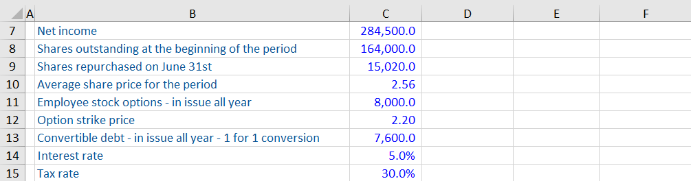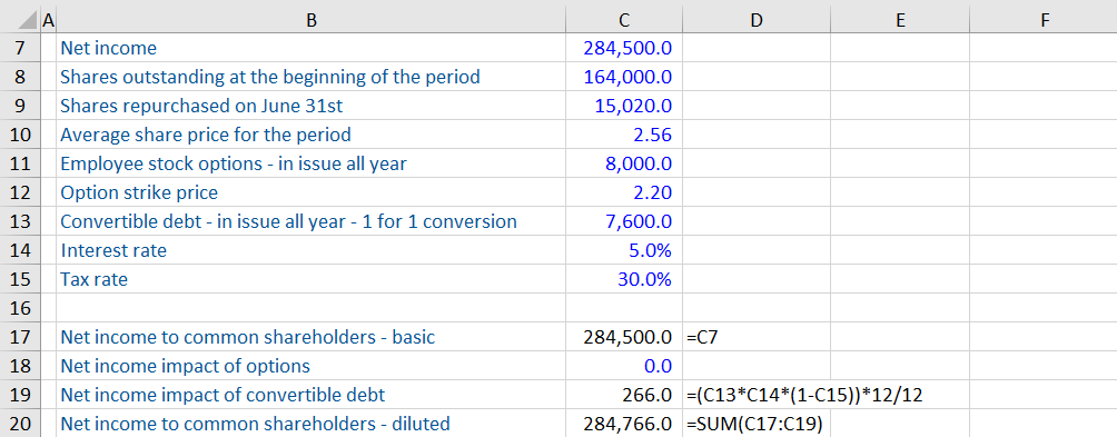 The calculation above looks similar to basic EPS, but there are a number of key differences. First, the earnings used for diluted EPS (those available to common or ordinary shareholders) are adjusted for convertible bond interest. The process used is called the “as if” converted method. Basic earnings are increased by the post-tax interest saved as a result of the bond converting to equity.