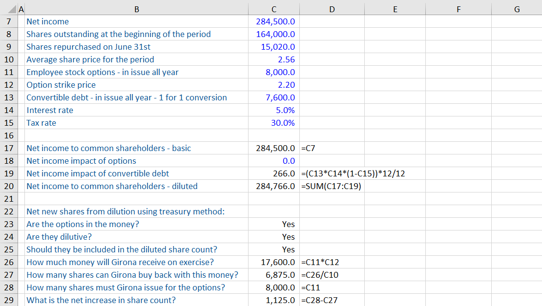 Next is to adjust for the net new shares created from options using the “treasury method”. This assumes that the business will use the cash raised from the options exercised to buy back shares from the market and therefore minimize the dilution effect.