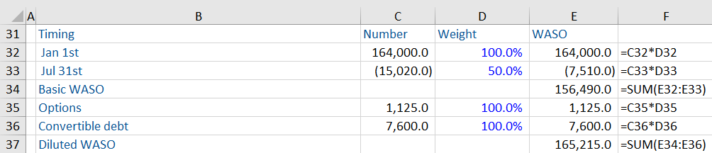 The number of shares outstanding now needs to be adjusted to calculate the basic and diluted WASO. The number of shares outstanding at the beginning of the year was 164,000. The only change to the share count during the year was a buyback that happened after six months, therefore only six months impact is included in the basic WASO.