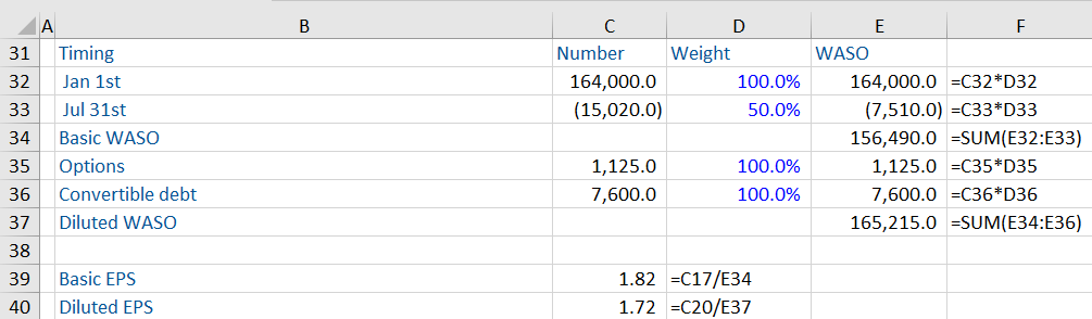The second part of the calculation is the fully diluted WASO. This starts with the basic WASO, but includes any contracts the business has which might increase the future share count. Only those which cause a decrease (dilution) of EPS are included in the calculation.