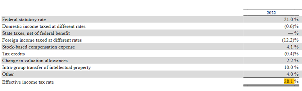 Most companies also publish a table showing their tax position, with a helpful reconciliation in either currency (e.g. $, £) or % terms. Companies preparing their financial statements using US GAAP or IFRS will always have a table of this kind. For Paypal 2022 you can follow the link here to see where you’d find the table in their footnotes. We’ll use this reconciliation in the MTR section below to explain ETR vs the marginal tax rate (MTR).