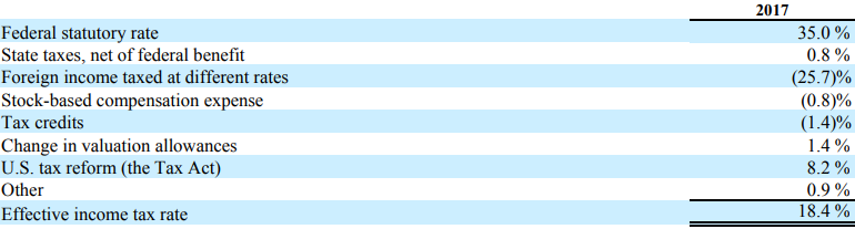The above table allows us to see why the company isn’t paying the MTR on all its profits. For Paypal, it’s paying less on foreign income (it’s seeing a 12.2% reduction in ETR due to this, and makes sense given the lower tax rates of some countries it operates in). Paypal has, however, made some transfers of intellectual property. This has come with a tax charge, and increased its effective tax rate by 10%.